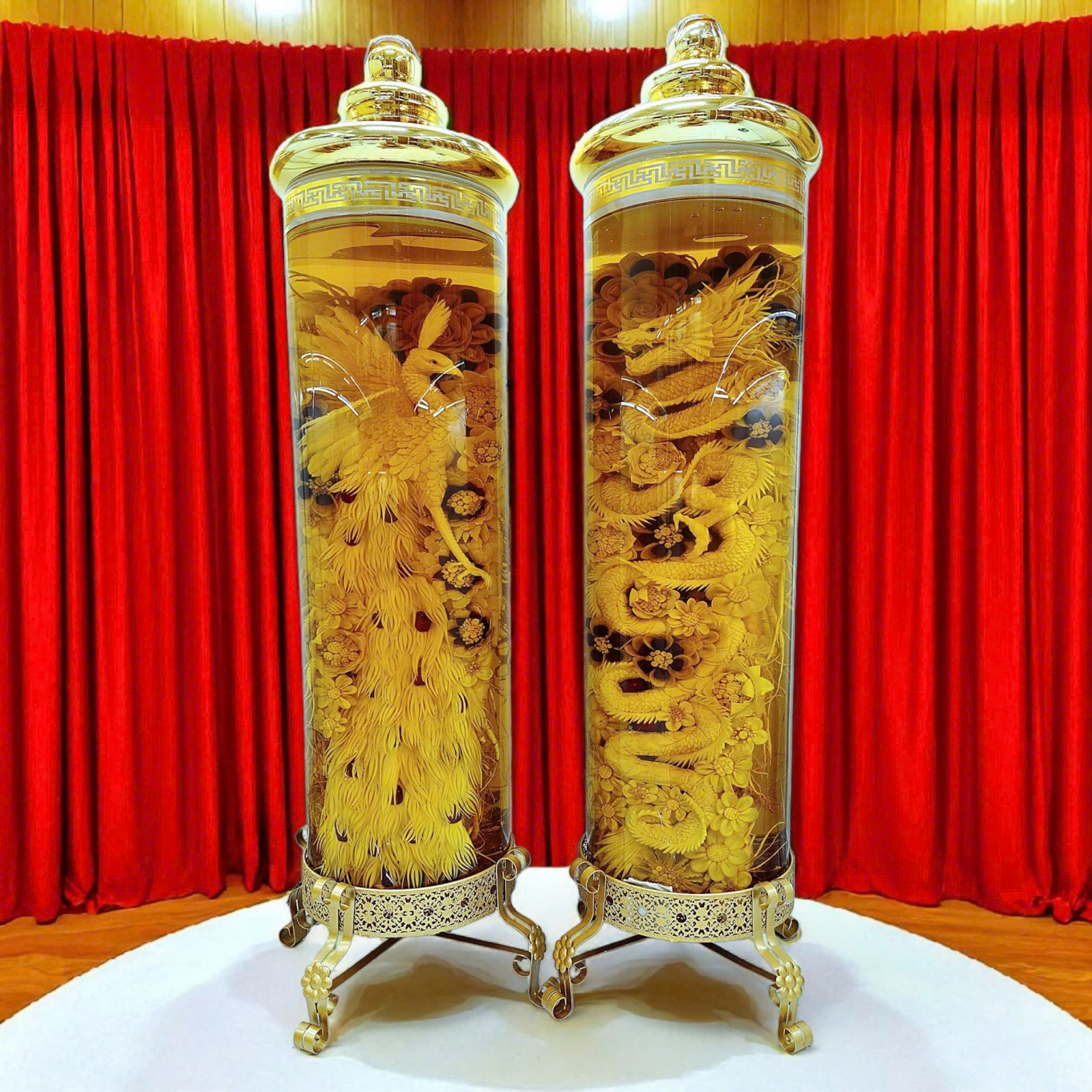 Bình sâm điêu khắc hình Long Phụng Sum Vầy 70 lít được tạo nên bởi những củ nhân sâm tươi Hàn Quốc, được chạm khắc tinh xảo bởi bàn tay tài hoa của những nghệ nhân trong nghề đang được đông đảo người tiêu dùng săn đón.