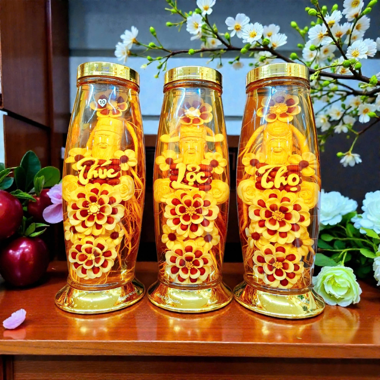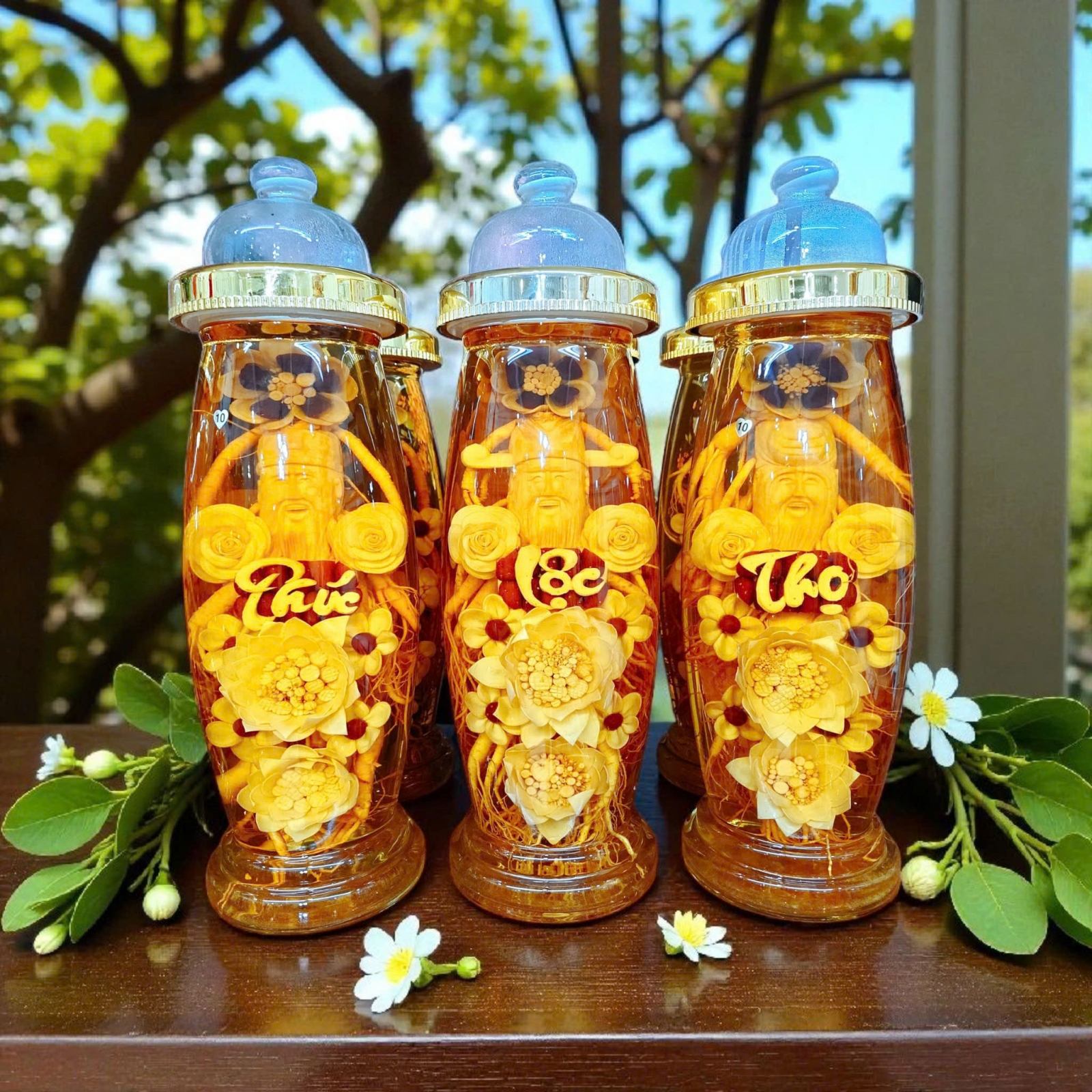 Bình Sâm Điêu Khắc Phúc Lộc Thọ 10 Lít (1 bình)   được sản xuất trực tiếp 100% tại Sâm Yến Trang Minh mà không qua trung gian. .Bình sâm điêu khắc Phúc Lộc Thọ 10lít được lấy cảm hứng từ hình tượng thiêng liêng này, dòng sản phẩm bình nhân sâm Hàn Quốc khắc hình Phúc Lộc Thọ sẽ là một lựa chọn tuyệt vời khi không chỉ đảm bảo sức khỏe mà còn làm tăng thêm độ đẹp mắt cho người nhìn. Được ngâm kết hợp độc đáo từ củ nhân sâm tươi có tuổi đời trên 6 năm tuổi, qua đôi tay của các nghệ nhân điêu khắc đã làm nên tuyệt phẩm vô cùng sang trọng, sắc sảo. Hoa sâm được kết lại từ những lát sâm tươi tỉa hoa độc đóa tạo nên 1 sản phẩm vừa sang trọng, đẳng cấp. Đây sẽ là món quà tặng quà biếu ý nghĩa cho người nhận trong những dịp, sự kiện đặc biệt.